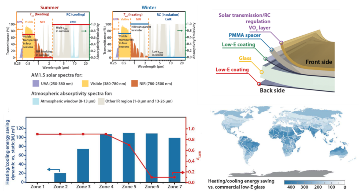 针对此问题,我校环境科学与工程学院蒋腾耀副教授与新加坡南洋理工大学、美国怀俄明大学等合作团队首先提出了同时调控太阳光和长波红外线两个波段的理想智能窗户模型。相较于传统智能窗户只考虑太阳光波段的调控,多波段同时调控的智能窗户能够实现更优秀的建筑节能效果。基于此模型,研究团队设计并制备了一款双波段调控自响应智能窗。该窗户利用热响应钨掺杂二氧化钒纳米颗粒、聚甲基丙烯酸甲酯以及氧化铟锡涂层构成了一个法布里-珀罗谐振器,实现对于太阳光和长波红外线的双波段自响应调控,适用外界气温的变化。在建筑节能模拟中,该智能窗显示出比市售低辐射节能玻璃更优异的节能效果,实现了最高达324.6MJ/m2的制冷/制热节能。这项研究成果为智能节能建筑围护结构尤其是节能玻璃的发展提供了新的思路,同时也为全球的节能减碳事业贡献了独特的解决方案。