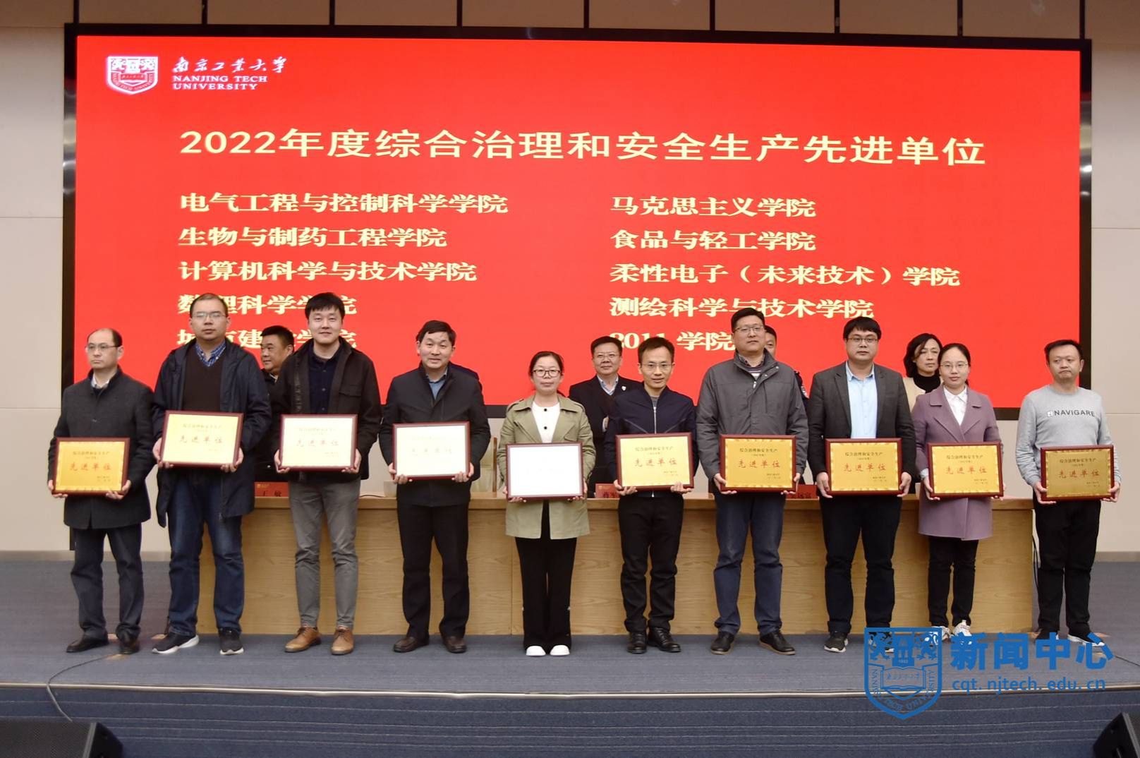 戴志晖副校长宣读《关于表彰2022年度校综合治理和安全生产先进单位及个人的决定》,主席台领导为先进单位及先进个人代表颁奖。安全科学与工程学院、生物与制药工程学院、化学与分子工程学院、海外教育学院和先进个人代表先后作交流发言。刘大卫副校长代表学校与四家二级单位主要负责人现场签订了《综合治理和安全生产责任书》。