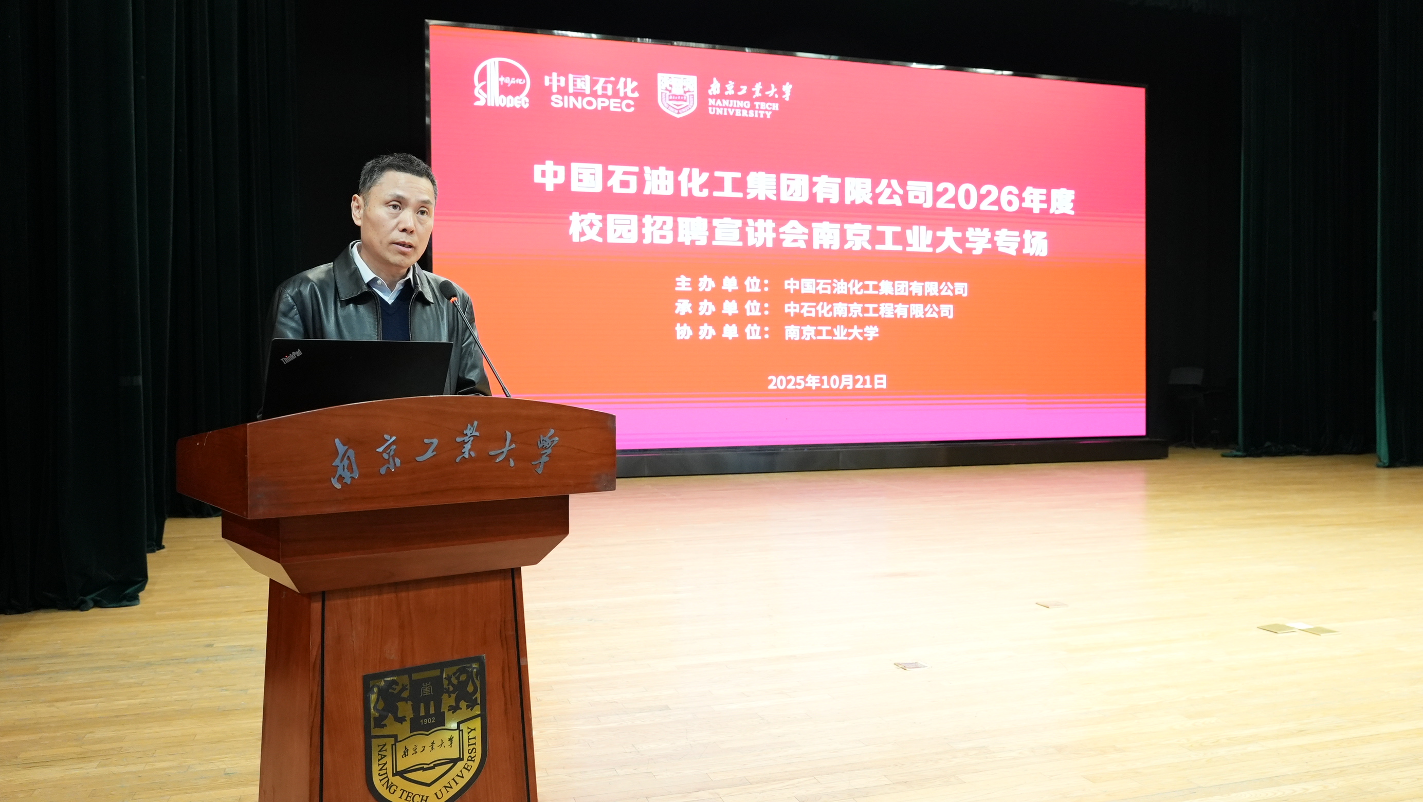 10月21日,中国石油化工集团公司2026年度校园招聘宣讲会在学校博雅堂举办。中石化南京工程有限公司执行董事、党委书记周赢冠,副总经济师、党委组织部(人力资源部)部长陈云祥,副校长刘大卫出席活动。