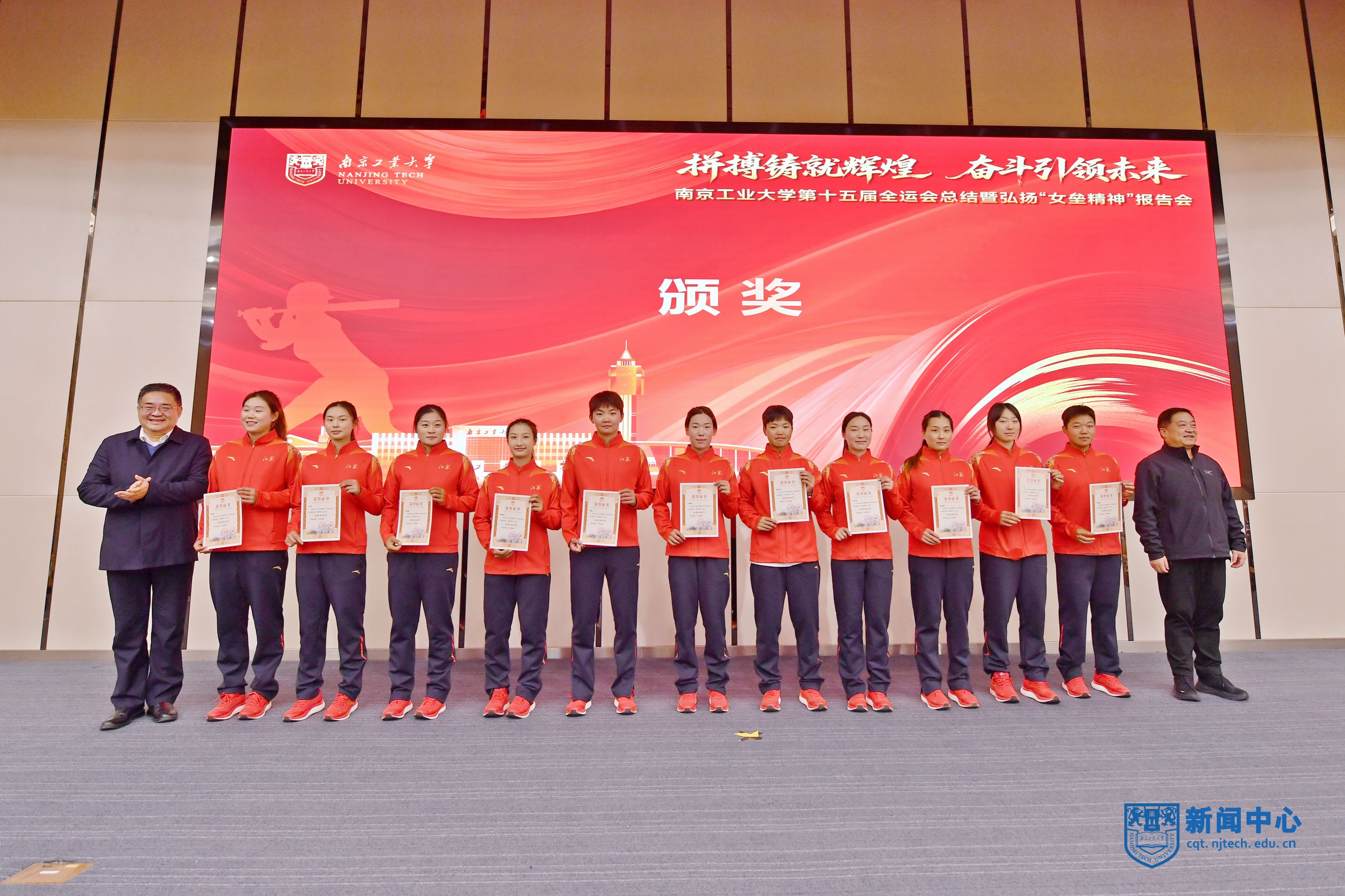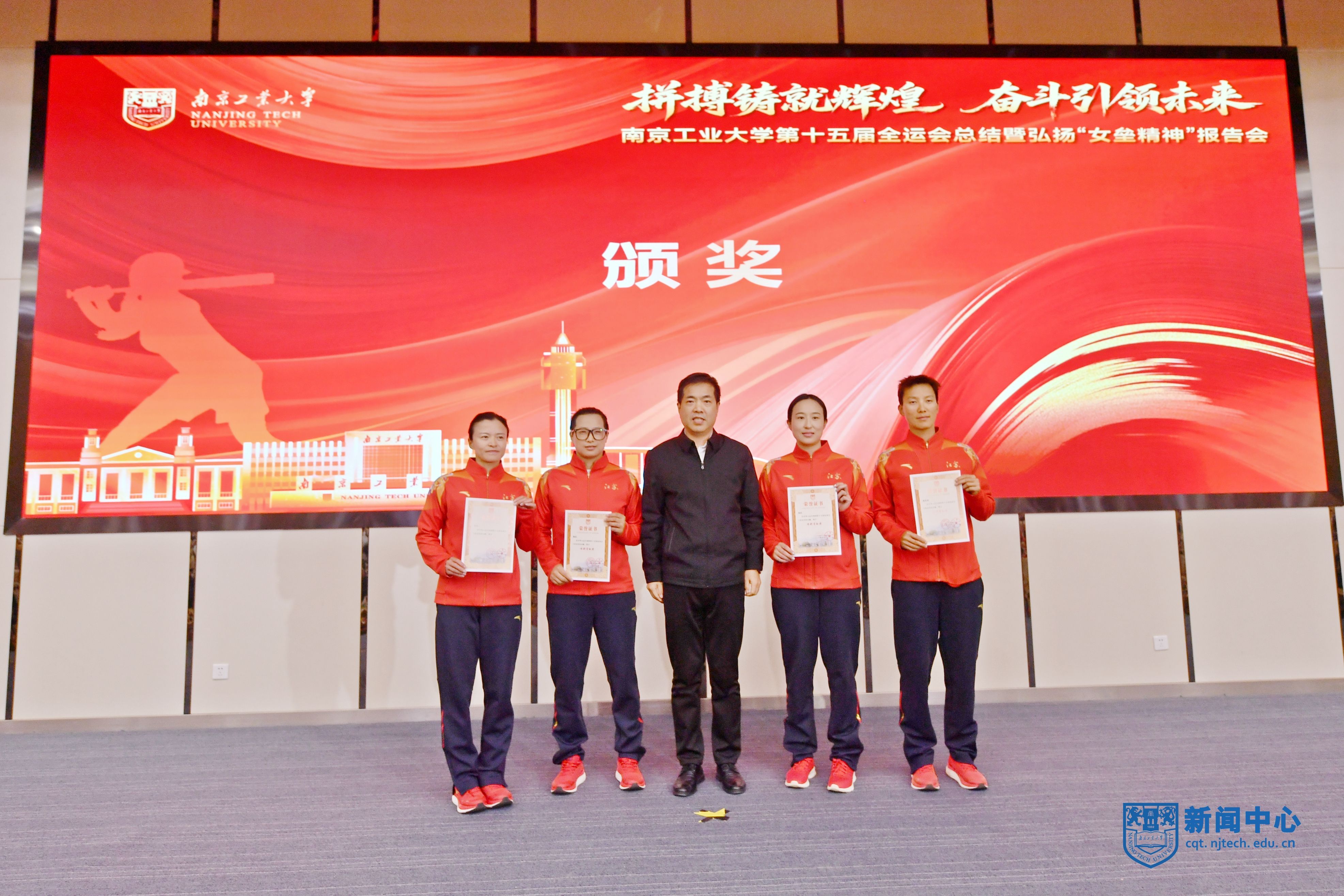 受表彰教练员、运动员代表,南工大江苏女垒原主教练宋秋元、现任主教练李欢、队长桑于娟、主力投手孙悦和队员李欣,分别进行了发言,回顾了南工大江苏女垒25年来从无名到冠军、从生存到辉煌,实现全运会“四连冠”的奋斗历程,以一个个鲜活的真实案例生动诠释了“奉献、拼搏、坚韧、协同”女垒精神的深刻内涵,表达了接续奋斗、再谱华章的决心。