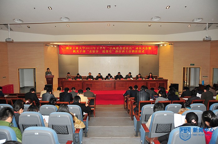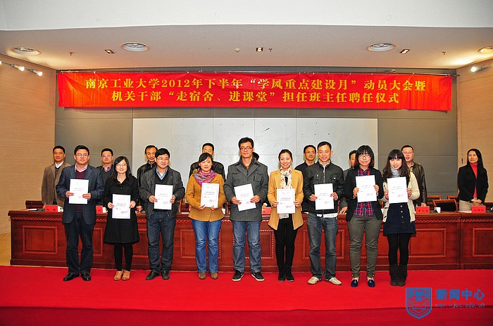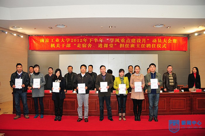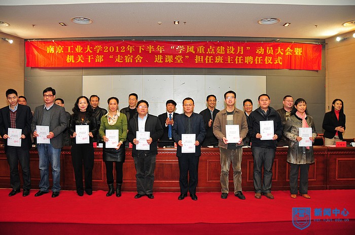 11月7日下午,2012年下半年学风重点建设月动员大会暨机关干部担任班主任聘任仪式在江浦校区逸夫图书馆一楼报告厅举行。校党委副书记、副校长高明、党政办、组织部、宣传部、教务处、保卫处、学生处、团委等相关部门负责人、各学院分党委(党总支)副书记、全体专职辅导员及新聘任的班主任参加了会议。会议由学生工作处处长何学军主持。