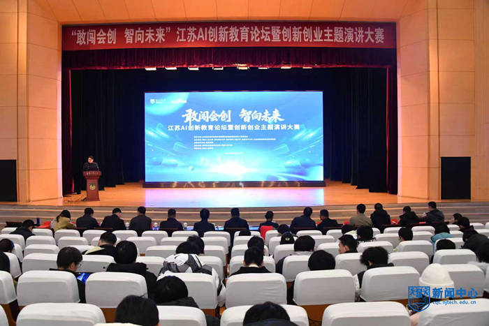 12月24日,“敢闯会创 智向未来”江苏首届AI创新教育论坛暨创新创业主题演讲大赛在博雅堂举行。江苏省高等学校教学管理研究会创新创业教育工作委员会秘书长沈孝兵、战略合作单位百度集团高校合作部副总监计湘婷、副校长陆伟东出席活动。