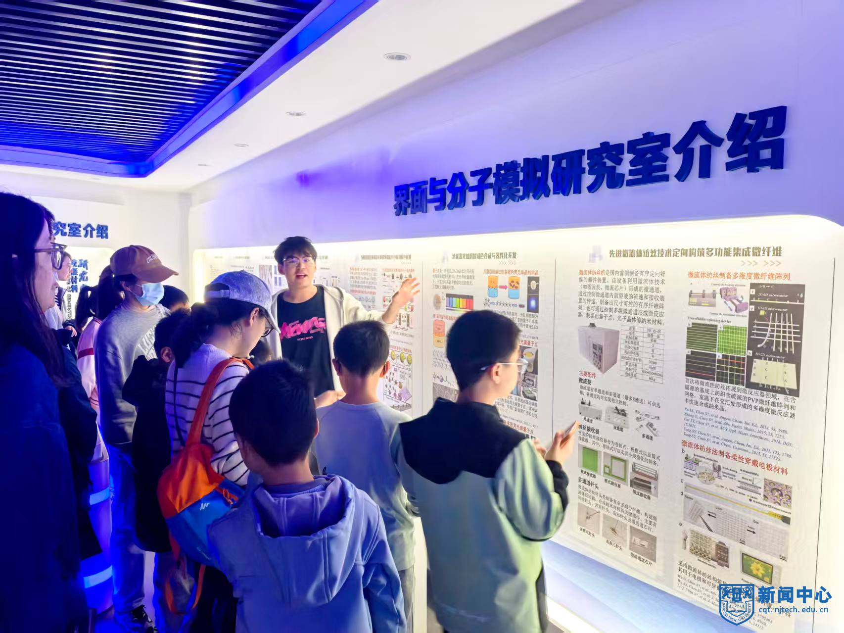 在材料化学工程全国重点实验室,志愿者结合动态工艺沙盘模型、前沿科技成果展品,生动讲述了实验室科研团队扎根领域、科研报国的先进事迹。时钧园里,志愿者讲述时钧先生毕生求索、矢志报国的励志事迹,阐释其“忠党爱国、淡泊坚韧、求实惟先、扶掖后学”的崇高精神。图书馆内,志愿者带领大家参观图书馆的藏书区、阅览区,详细介绍图书分类、检索方法,并沉浸式体验自助借阅系统。活动尾声,研学队伍前往天宝阁、音乐台等校园地标打卡。