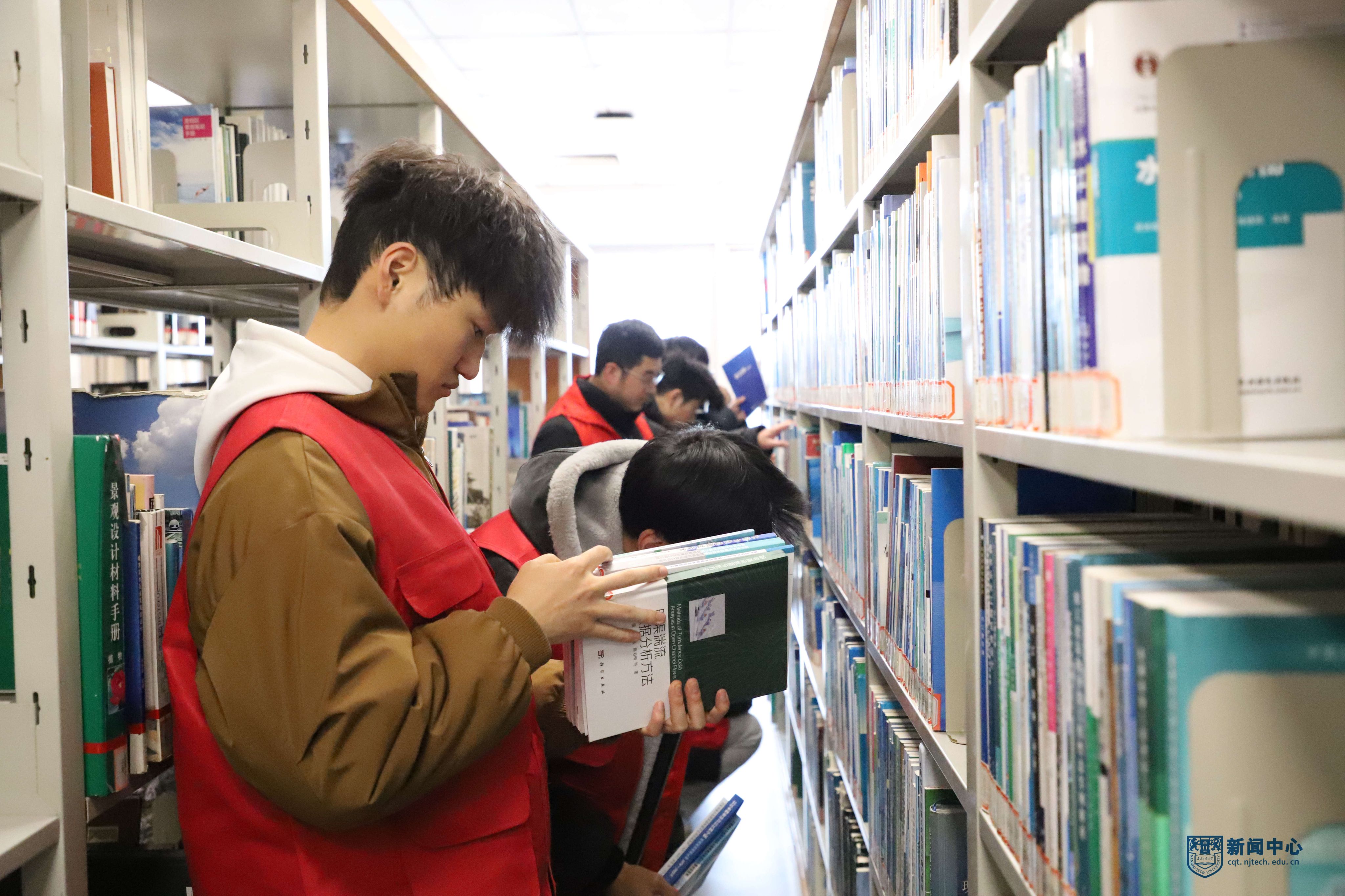 随后,同学们在工作人员的指导下分组行动。图书整理组的党员们化身“书籍摆渡人”,仔细核对图书编号,将散落书架的书籍归位上架,让杂乱的书架变得井然有序;文明引导组在阅览区、借阅处主动为读者提供咨询服务,耐心解答借阅流程、馆藏查询等疑问;环境优化组对阅览桌椅、书架角落、楼梯扶手等进行全面清扫。各小组各司其职,形成一道道亮眼的“志愿红”风景线。