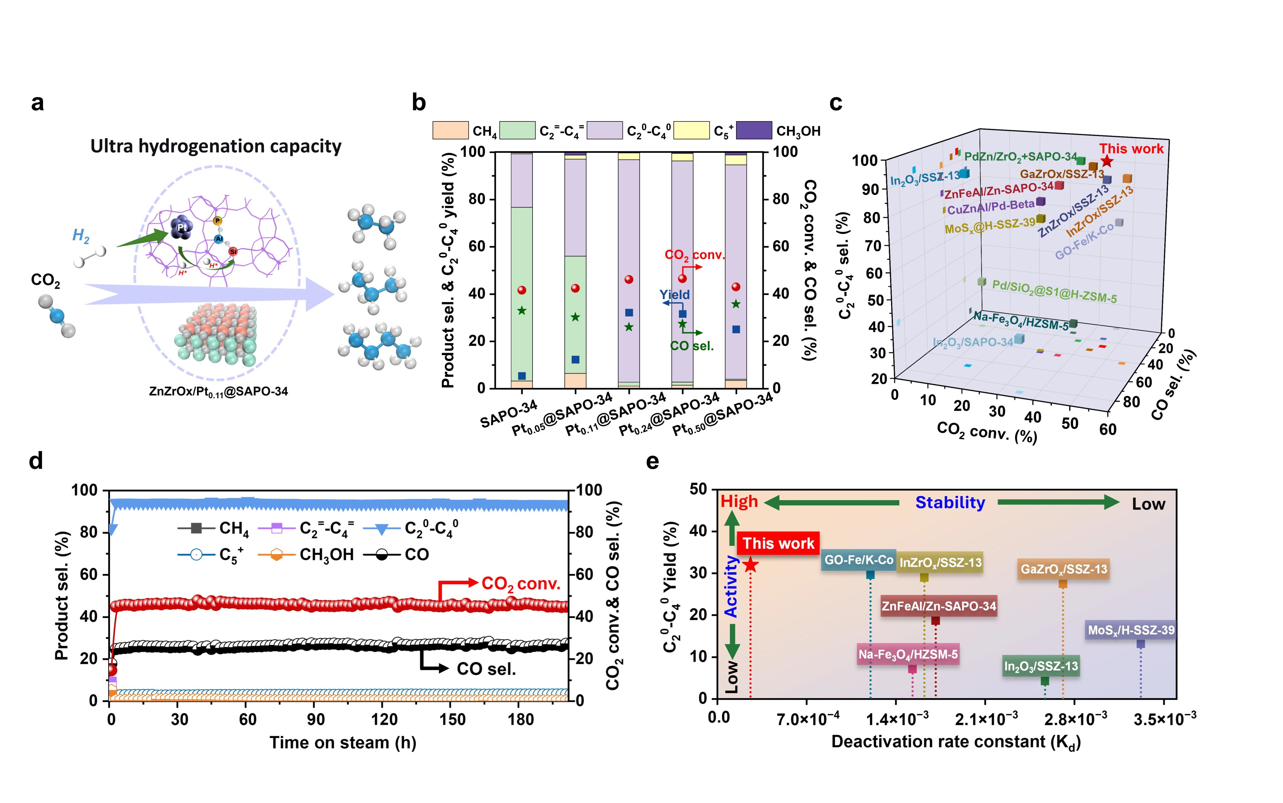 在“双碳”目标下,实现CO2加氢制低碳烷烃(C20–C40)具有重要的战略意义。近日,化工学院徐乐教授团队发展了一种使用ZnZrOₓ固溶体和Pt限域SAPO-34分子筛组成的双功能催化剂体系,实现了46.1%的CO2高转化率与94.1%的C20–C40选择性,并展现出超过200小时的优异稳定性,为解决OXZEO催化剂体系中长期存在的“活性-选择性-稳定性”难以兼得的难题提供了新思路。南京工业大学为第一完成单位,2023级硕士研究生崔锦松和2025级博士研究生蒋晗为共同第一作者。南京工业大学徐乐教授、华东师范大学吴鹏教授、苏州国家实验室庹杰助理研究员、四川大学王岩副研究员为本文的通讯作者。