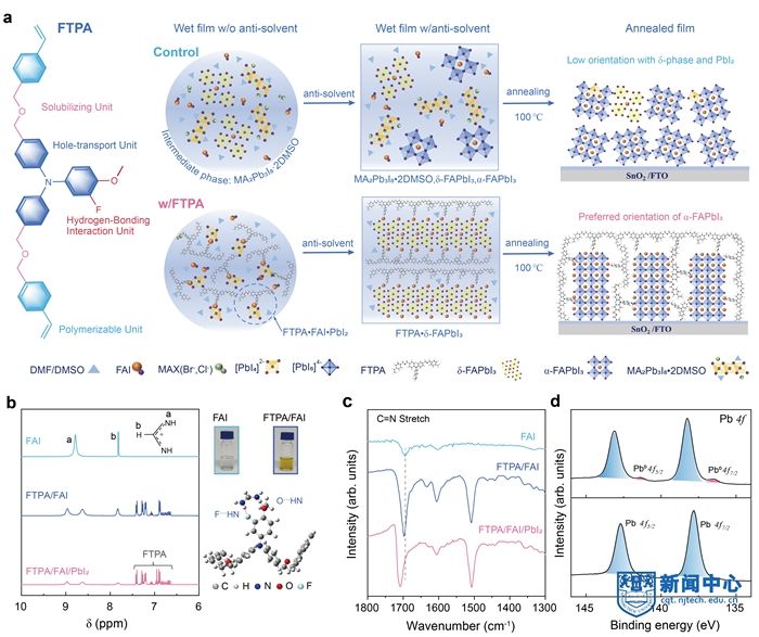 近日,柔性电子(未来技术)学院黄维院士、秦天石教授、王芳芳副教授团队在钙钛矿太阳能电池领域取得了重要成果,以“Orientated crystallization of FA-based perovskite via hydrogen-bonded polymer network for efficient and stable solar cells”为题发表在国际权威期刊《自然•通讯》上。