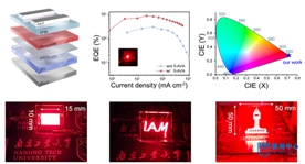 针对上述问题,本团队提出了一种基于逐层热蒸发的钙钛矿发光薄膜制备策略。通过依次沉积钙钛矿前驱体薄膜,并引入可蒸发的分子型添加剂,有效抑制了蒸发过程中的不可控的原位反应,调控了后退火过程中的晶体生长速率,从而显著提升了薄膜的结晶质量。同时,添加剂对缺陷态的有效钝化显著增强了载流子辐射复合效率,显著提高了薄膜的发光性能。基于该策略,团队成功制备出发射波长分别为660 nm与730 nm的热蒸发红光钙钛矿LED器件,器件外量子效率分别达到9.0%与7.27%,亮度超过1500 cd m-2与200 W s-1m-2。此外,还实现了尺寸达50×50 mm²的大面积均匀图案化发光薄膜与LED器件,展示出热蒸发工艺在推动钙钛矿LED实用化方面的巨大潜力。该工作得到了国家自科基金、苏州实验室开发课题、省自科基金项目的支持。