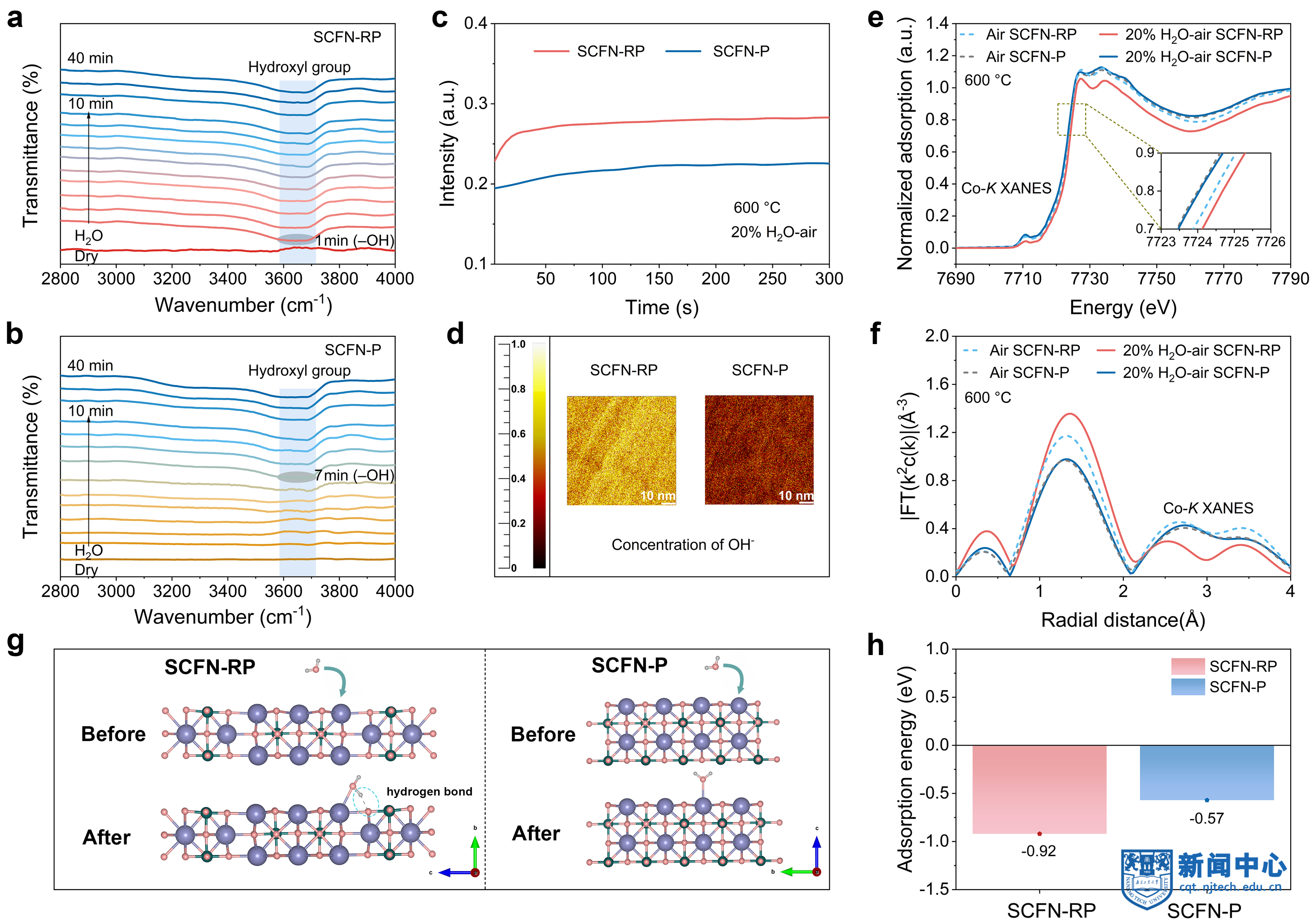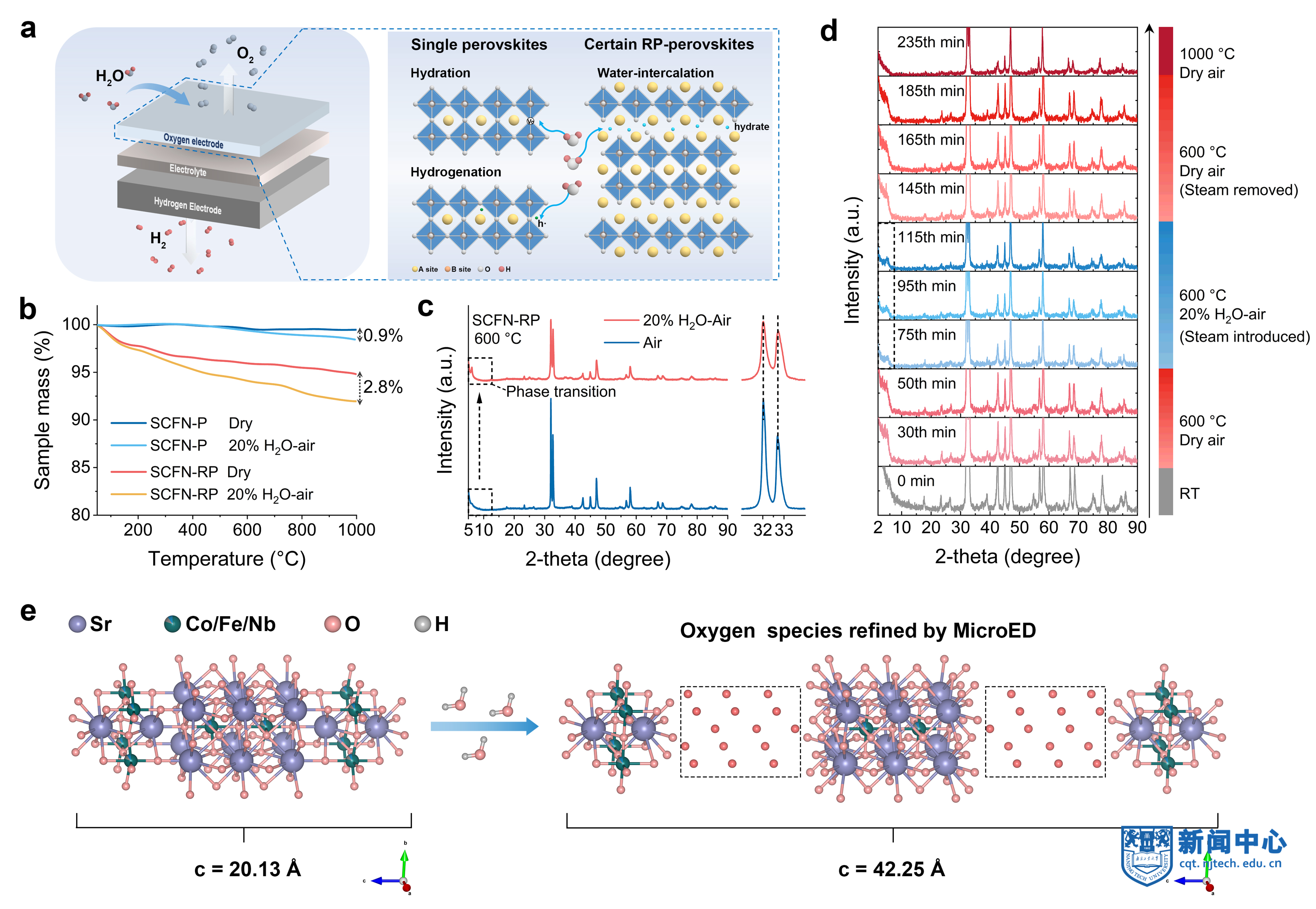 该研究构建了一种在高温水蒸气条件下能够发生可逆相变并形成水合羟基氧化物的Ruddlesden-Popper(RP)型氧电极Sr3(Co0.8Fe0.1Nb0.1)2O7-δ(SCFN-RP),成功突破了单一钙钛矿的水合极限。研究首次采用微晶电子衍射(MicroED)结合密度泛函理论(DFT)计算,揭示了RP结构中层间质子捕获位点的形成机制。水合羟基氧化物的形成构建了跨界面氢键网络,新增质子传输位点并形成多步跳跃迁移路径,突破了RP相质子传输局限于二维层内路径的瓶颈,大幅加速质子传输与水合过程。因此,SCFN-RP在550°C、1.3 V下实现了1.01 A cm-2的电流密度。该研究强调了RP型钙钛矿中可逆水合羟基氧化物的关键作用,为设计高性能PCECs氧电极提供了新思路。