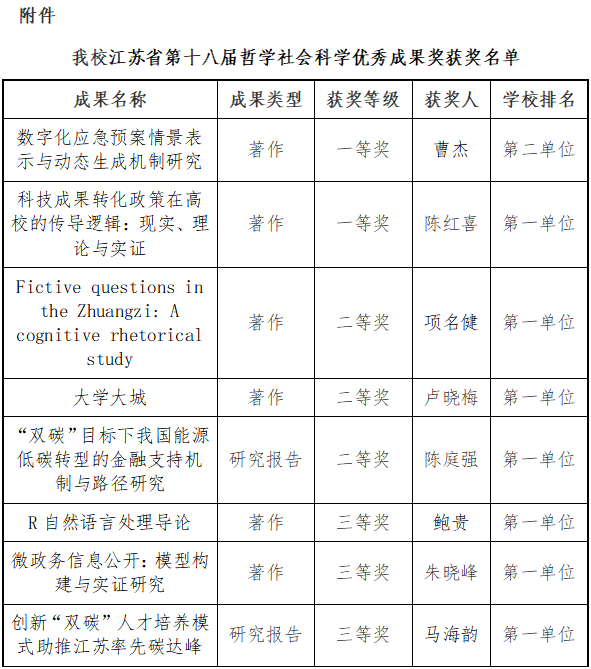 据悉,江苏省哲学社会科学优秀成果奖是我省社科界唯一的省级政府奖,每两年评选一次,至今已评选十八届,是江苏省哲学社会科学领域的最高奖项,旨在鼓励全省人文社科工作者积极探索、勇于创新,促进江苏省哲学社会科学的繁荣发展。