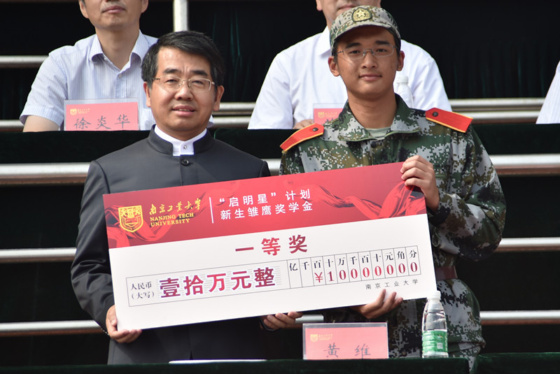南京工业大学26日举办了2015级本科生新生开学典礼暨军训汇报演出。在开学典礼的发言上,中国科学院院士、南工校长黄维和学生聊起了“颜值”与美,引来学生的“点赞”。更为励志的一幕是,一名来自海南的大一男生刘必进从校长手中接过了 “新生雏鹰奖学金”一等奖,获得10万元的奖学金。