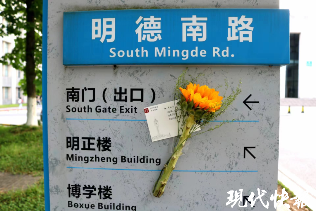 即将离开校园,杨紫檀满是不舍。更难忘的是,前几日,她还在校园里收到一份惊喜:明德南路路牌上贴着的一支向日葵和一张送给毕业生的明信片。