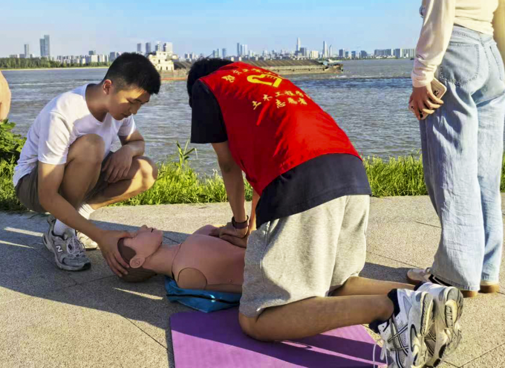 同日,为迎接7·25“世界预防溺水日”,急救宣传小组走进扬子江畔开展防溺水宣传。志愿者通过展板讲解、手册发放、假人实操演示等方式,向群众普及“不私自下水、科学施救”等核心原则,手把手指导胸外按压等急救技能,强化群众“主动预防、科学应对”的安全意识,用专业服务织密夏日生命防护网。