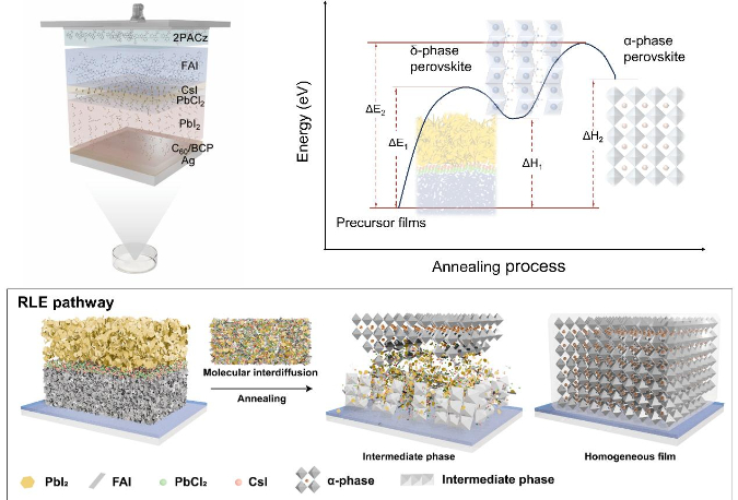 论文通讯作者郭庆勋副教授形象地表述道,传统做法可能是先铺金属卤化物“砖块”,再浇甲脒氢碘酸盐“水泥”;而他们的新方法则是反其道而行之,先沉积“水泥”,再沉积“砖块”。这种巧妙的顺序,结合一种自组装分子的“粘合剂”作用,在后续退火时能极大地促进固态原料之间的相互反应和扩散,最终“生长”出高质量、结构完美的钙钛矿晶体薄膜。