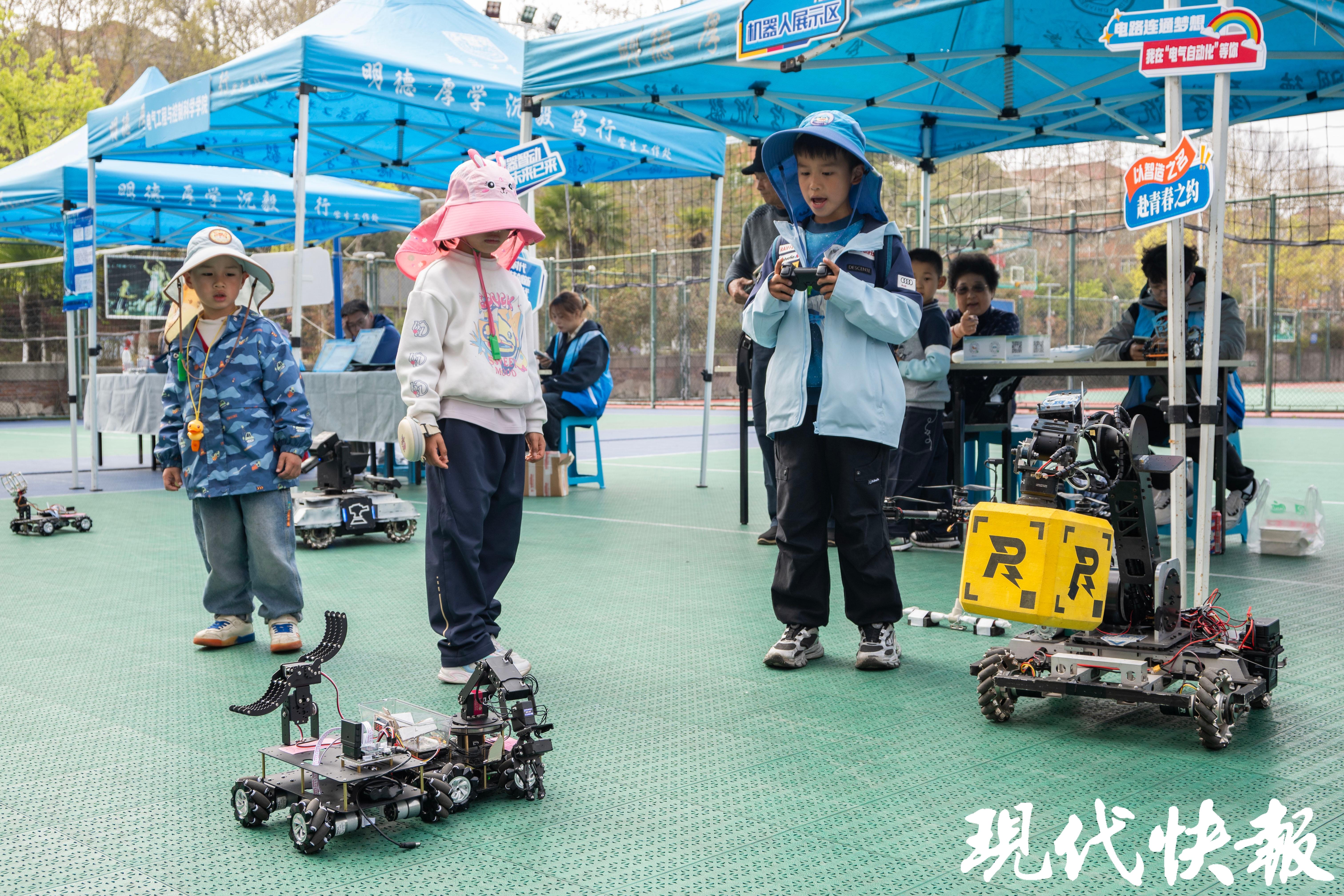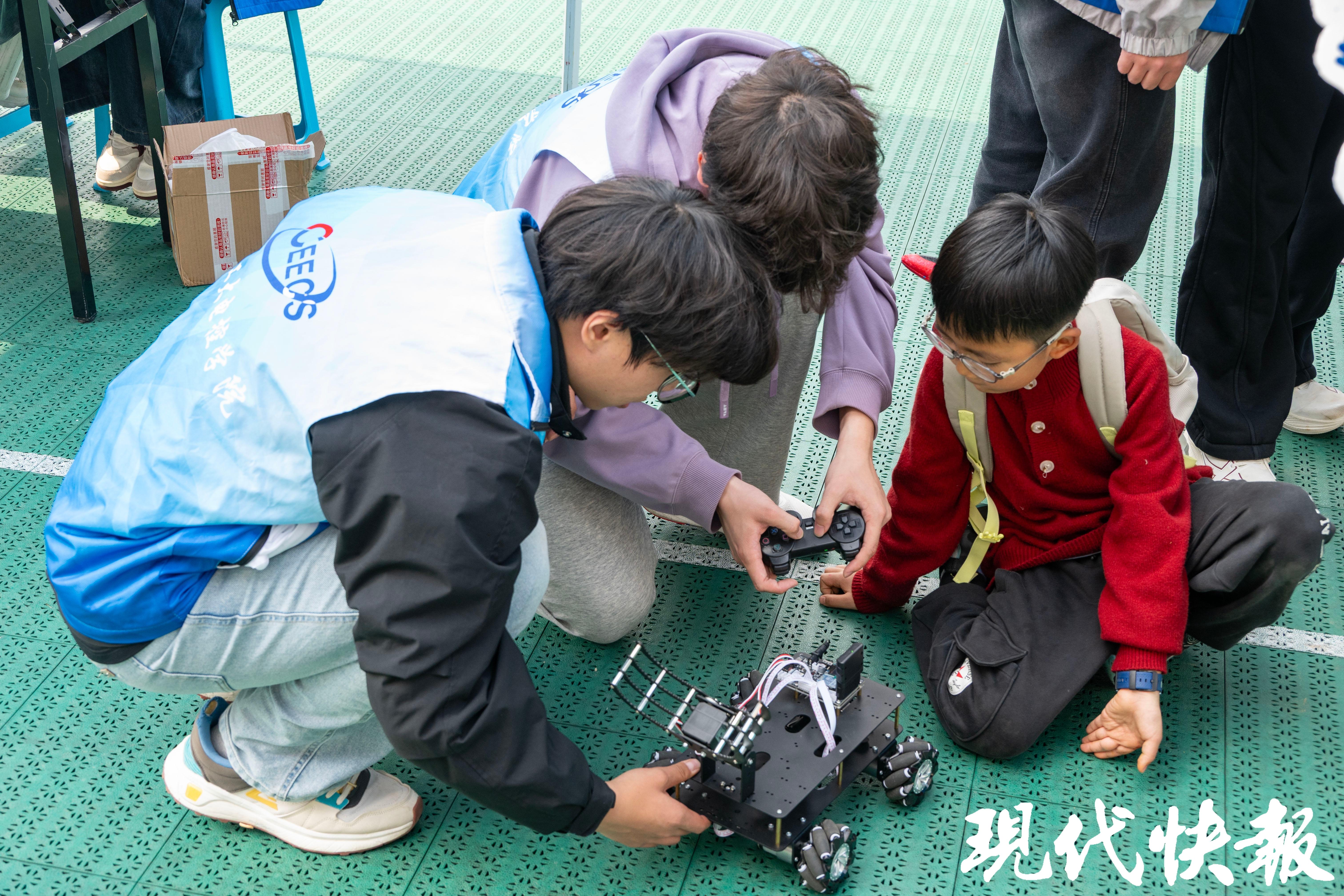 另一边,东苑篮球场传来阵阵惊叹与欢笑声。电气工程与控制科学学院大三学生、曾获robomaster机器人大赛二等奖的白一廷,正向围观的小朋友们讲解步兵机器人的构造。“我们国家现在非常重视机器人,很多技术和我们学的电机控制、运动控制是一脉相承的。”