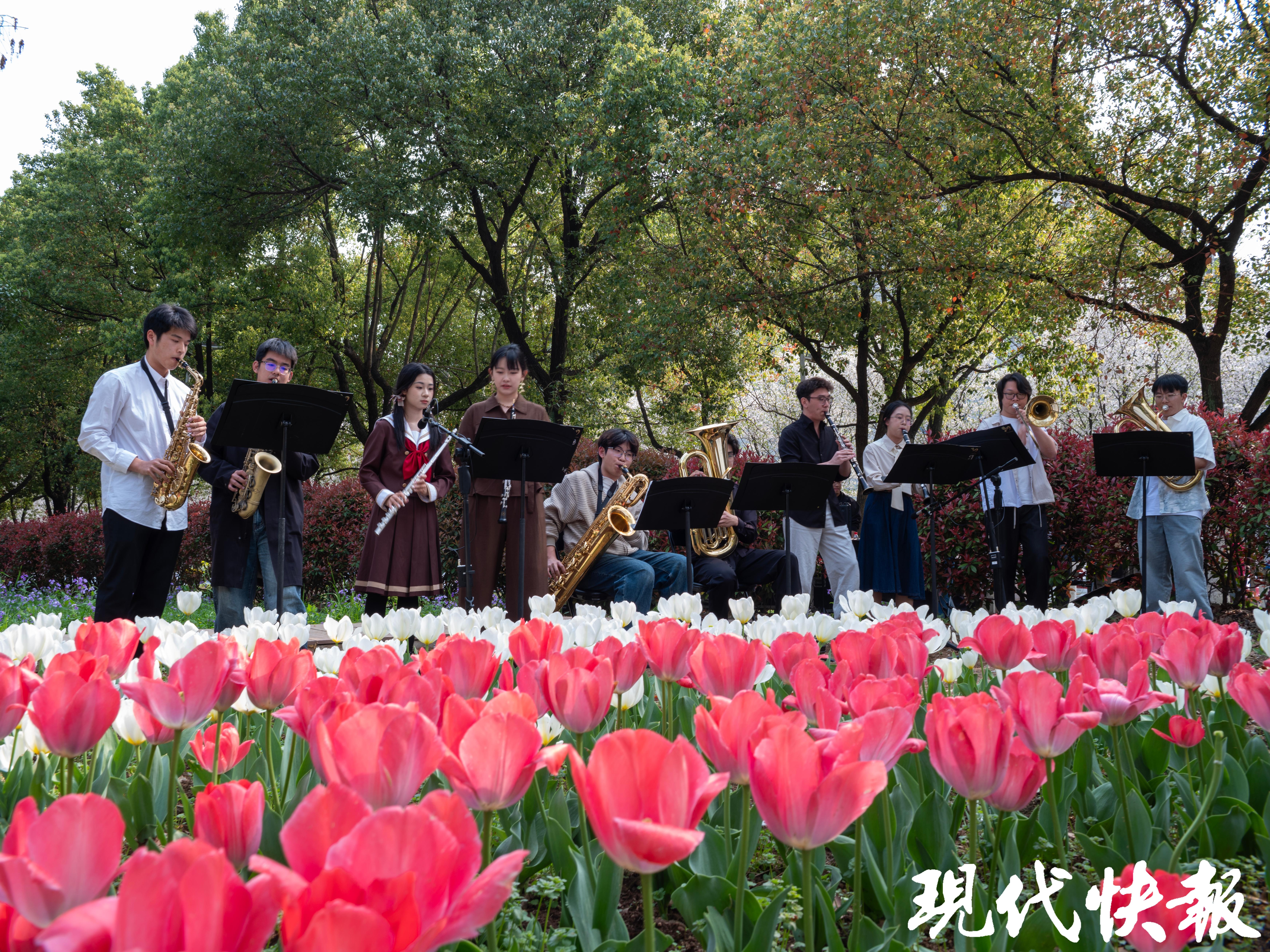池杉林畔,南工大大学生艺术团倾情演绎,婉转的旋律在林间悠悠回荡,与春风鸟鸣相融,市民们缓步徜徉,在绿意与乐声中享受春日美好。循着悠扬乐声行至沉毅广场,舞蹈团的舞姿灵动曼妙,棍道表演的招式飒爽利落,魔术社团的表演引人入胜,一场场精彩演出轮番登场,市民游客纷纷驻足围观、拍手叫好。