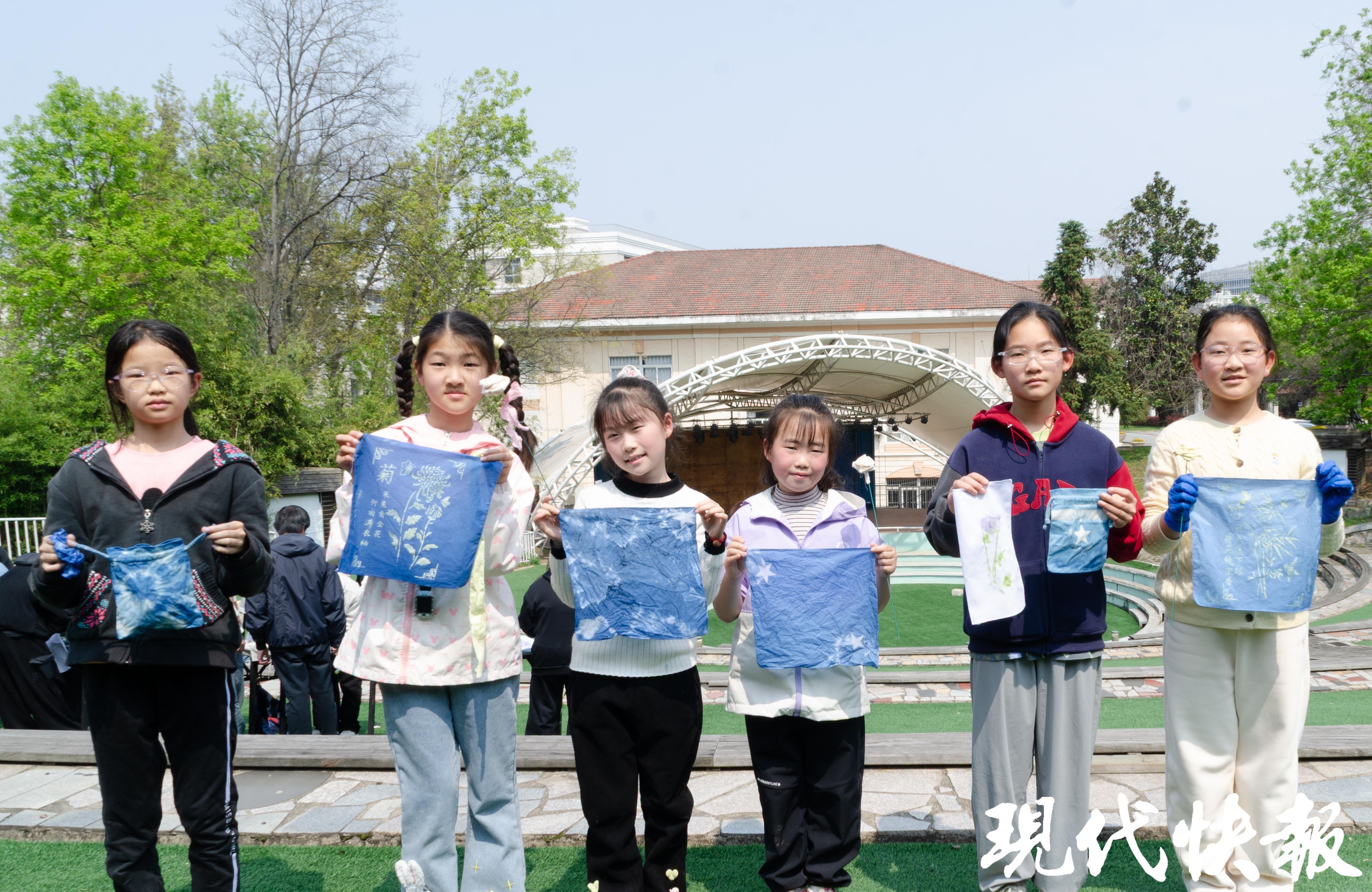 除此之外,大学生们还带着孩子们体验拓染与型糊染:采撷春日花草以石块拓印于布,用独特方式定格春光;甄选梅兰竹菊的纹样做型糊固定,让传统工艺的巧思在指尖绽放。