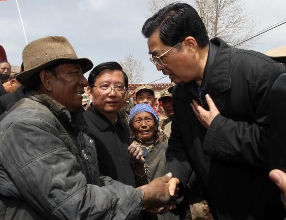 在救灾帐篷前,面对围拢过来的受灾群众,胡锦涛大声说:“乡亲们,你们受苦了!玉树地震发生后,中央的同志忧心重重。听到你们有的失去了亲人,有的失去了家园,我们和你们一样难过。今天,我特地来这里,向大家表示亲切的慰问!”