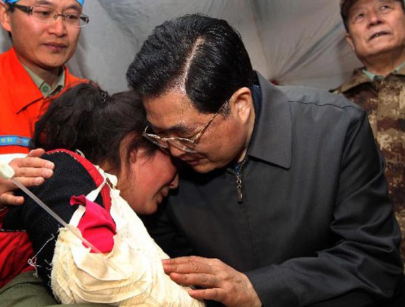 玉树强烈地震发生后,正在国外访问的胡锦涛总书记对灾区群众万分牵挂,第一时间就做好抢险救灾工作作出重要指示,并当即决定提前结束访问回国。17日下午14时20分许,经过近25个小时长途飞行后,胡锦涛总书记从大洋彼岸回到北京。当天下午16时,总书记不顾旅途劳累,立即主持召开中央政治局常务委员会会议,听取抗震救灾工作汇报,研究部署下一步抗震救灾工作。18日一大早,总书记又乘飞机赶赴抗震救灾第一线。一上飞机,总书记就把随行的有关方面负责同志召集到一起,打开地图,详细询问玉树抗震救灾最新情况,讨论研究具体办法对策。